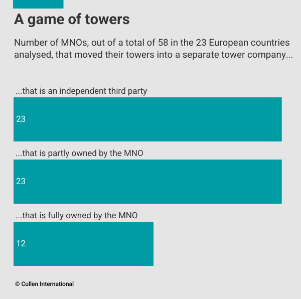 MNOs can either move towers into a fully owned legally separate company or sell, partially or completely, the passive equipment to tower companies or other stakeholders or funds.